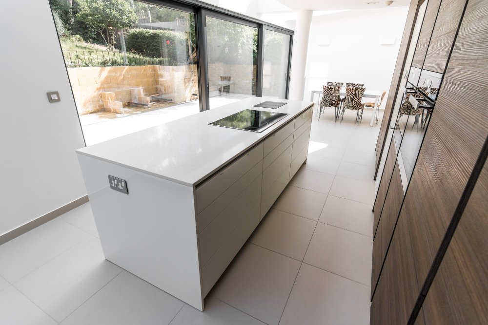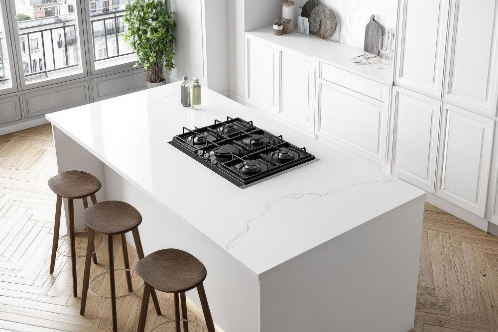 L’îlot peut accueillir des prises, des plaques à induction ou des rangements discrets.