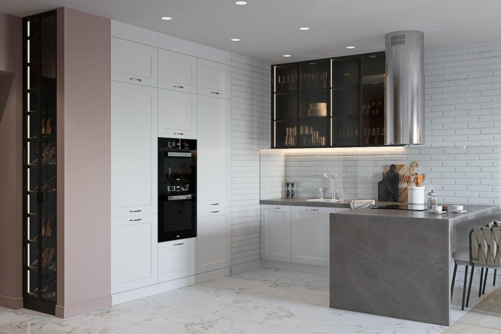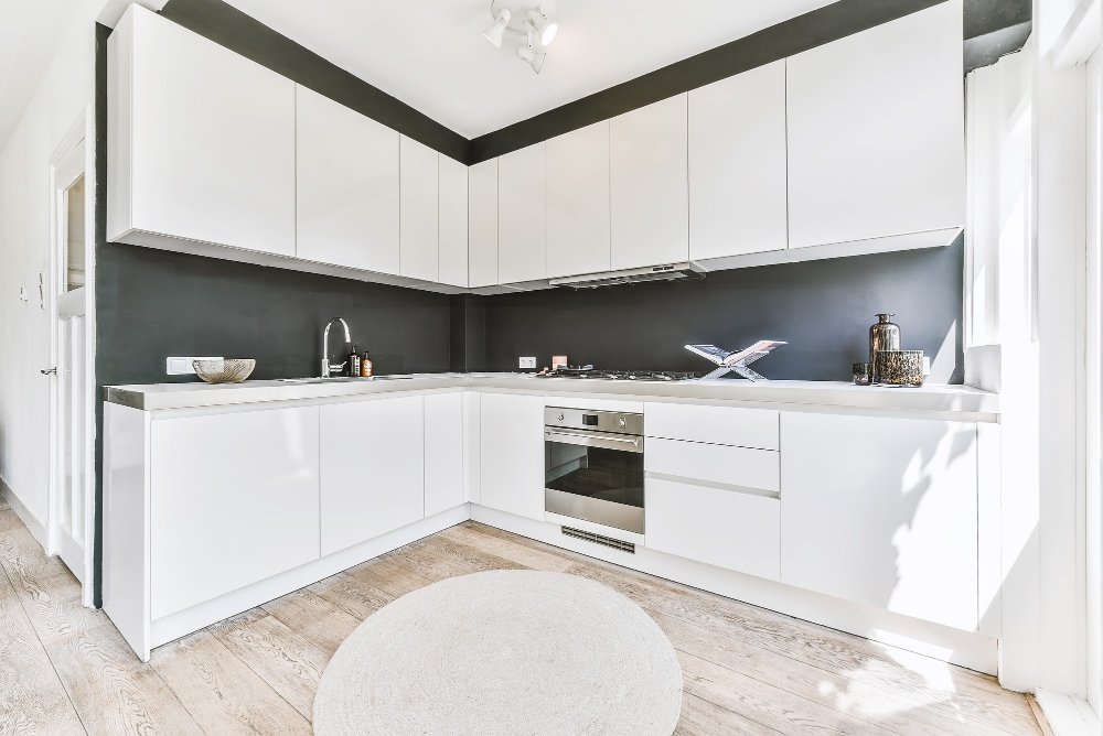 Deux pans de meubles forment un angle droit, facilitant le triangle de travail.
