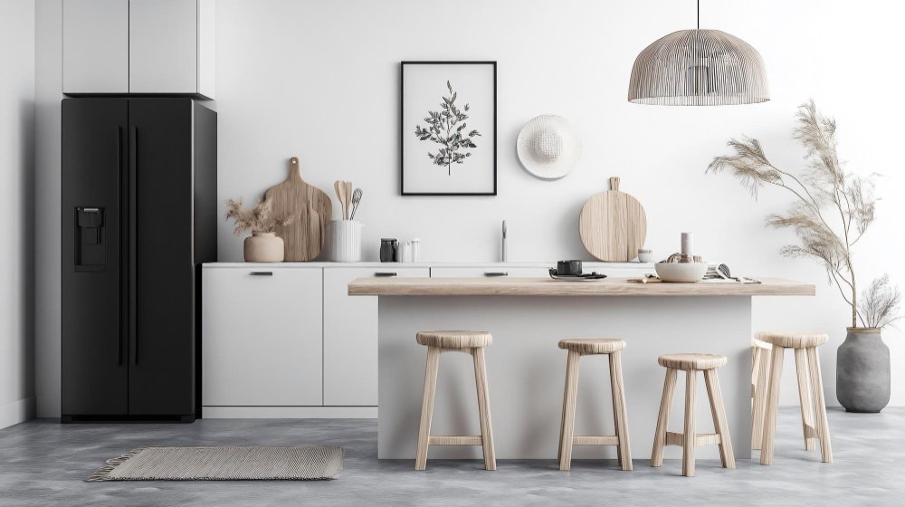 Contrastes doux noir-blanc, éléments métalliques et motifs subtils sur le carrelage.